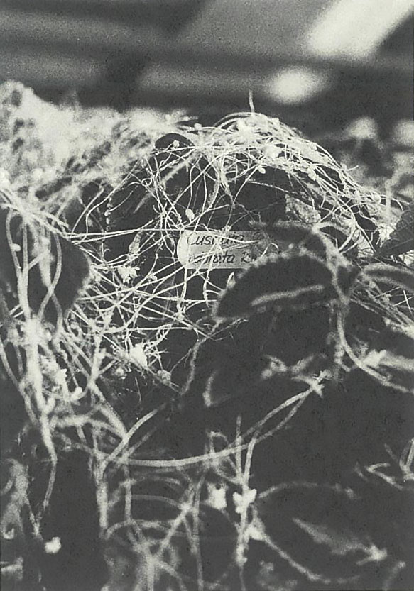 面白い例としてはネナシカズラ。芽生えの最初は自身の根で生活するが、一生の大部分は他の植物の枝茎にとりつく。まさにネナシカズラだ。ドイツのフランクフルト大学植物園の温室の一角で、鉢物をおおいつくしていた糸状植物クスクータ・オドラータを見た。ネナシカズラの一種。ヤドリギと同じような展示にきめの細かい気配りが感じられた。