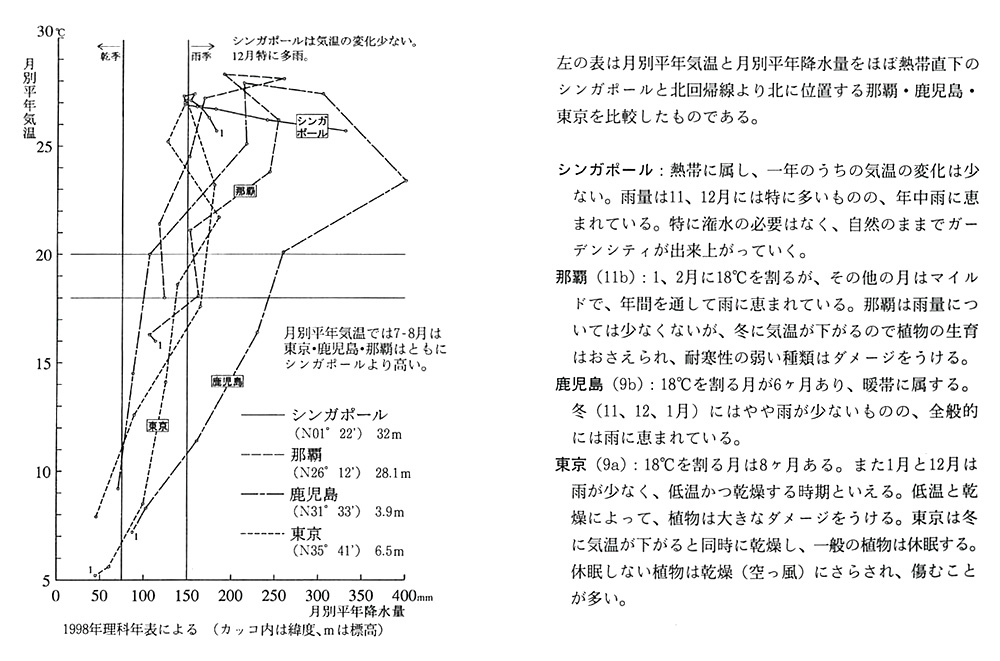 那覇(11b):1、2月に18℃を割るが、その他の月はマイルドで、年間を通して雨に恵まれている。那覇は雨量については少なくないが、冬に気温が下がるので植物の生育はおさえられ、耐寒性の弱い種類はダメージをうける。