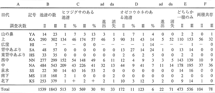 両種の住み分けから共存への経過を跡付けるため、両種が単独で見られる池溏と共存している池溏の数を第2次、第3次について調べた(Table.1 E、F)。しかし共存する池溏の増加は認められなかった。原が述べるような変化があったとすれば、第2次調査以前のことと考えられる。