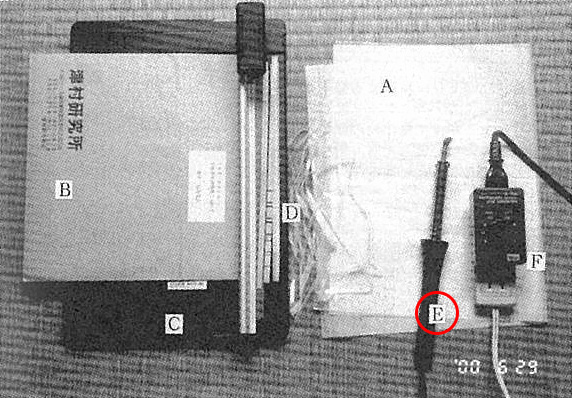 ヒートシールに使うハンダ鏝は前報のとおり、ラジオ用の先端(直径5mm)をいったん引き抜いて、平たく加工すればよい(Fig.1E).これはガスこんろとペンチと金槌があればできる。電流調節には、ハンダ鏝専用の小形コントローラーがある。私が購入したものは太洋電機産業製のパワーコントローラーPC-10(200W用)である(Fig.1F)。電灯用の調光器でもよい。これらはサイリスタ式のもので、最近は小形化したうえ安価になった。ラミントンで使われている接触抵抗式のコントローラーは、いつも同じつまみ位置を使うため、接触不良になって発熱することがある。サイリスク式にはその心配はないが、許容量より消費電力の大きい器具を使うと破壊される。またPC-10の場合には電源スイッチがついていないため、使用後はプラグから外しておかないと、常時電力を消費してしまうので注意せねばならない。電流調節はこういう出来合いのものがなければ、光量切り替えスイッチつきの電気スタンドを利用すればよい。