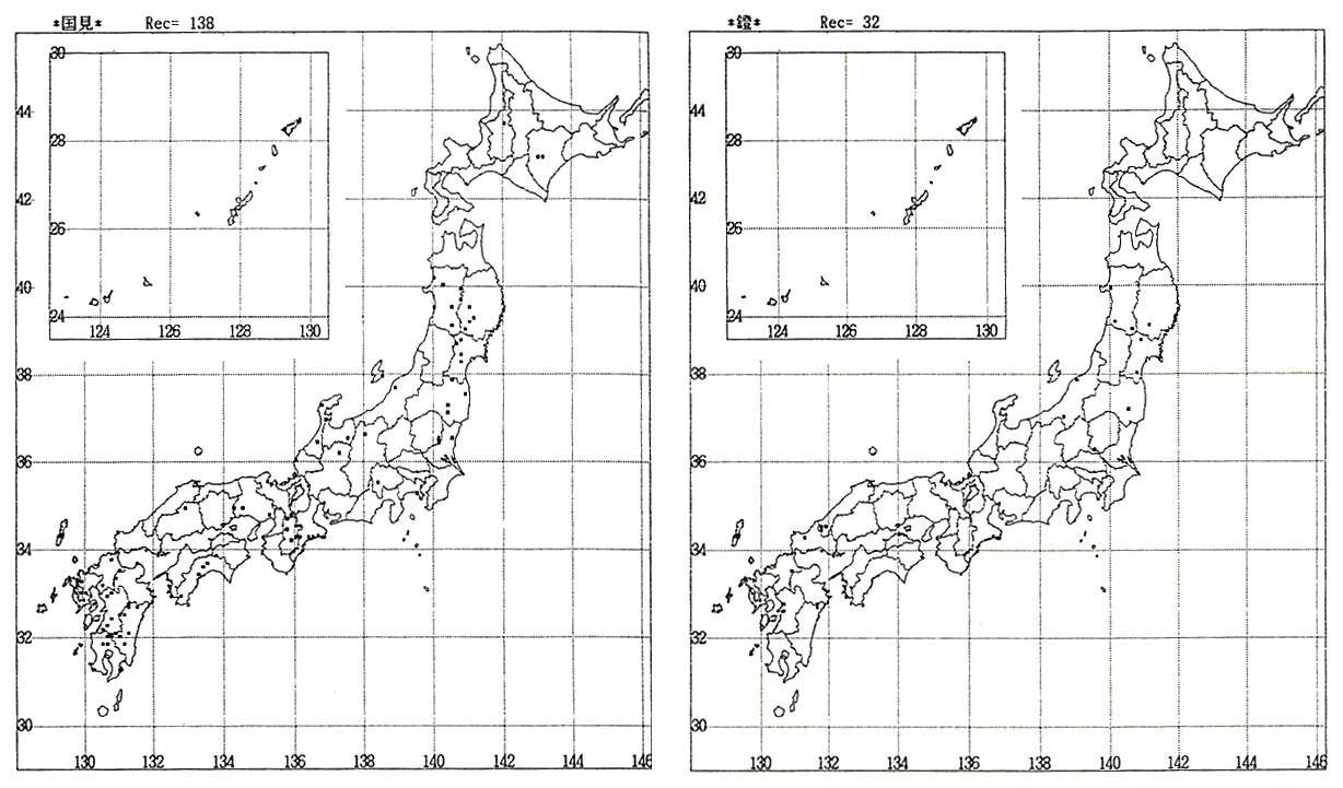 それよりは、植物以外の人たちが、地名分布図を簡単に作れることになかなか気付いてくれないのを、私は不思議に思っている。地図に代わって地名索引から目的の地名を抽出することには何の苦労もなくなった。その位置座標を用いて分布図は誰にでもできる。地名索引はデータベースになっているので、パソコンでデータを抽出して作図ソフトに流せば、全国規模の分布図が数分で得られる。地名や資料を扱う文科系の人達に、もっと手を出して欲しいと思っている。「他人の仕事を横取りしない」とか「自分の仕事に踏み込まれたくない」とかの気配りがあるらしいのだが、包丁を作った鍛冶屋がうまい料理を作れるとは限らない。作図ソフトは研究のためなら誰にでも提供する。