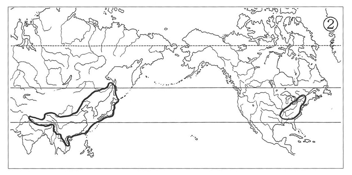 まず,東亜-北米東部型の分布域は前述のチョウセンニンジン属の分布が典型的であるが,アジアの分布域は北海道から九州までの日本列島と日本海,東シナ海を挟んで沿海州,中国北部,中国中部(主として揚子江流域)から時々更に東ヒマラヤまでにわたる地域にあり,他方,北アメリカの分布域はアパラチア山地を中心にして,多くは五大湖地方からミシシッピ川流域の東部まで広がっている.こういう分布をする植物群には他に,ザゼンソウ属,マコモ属,マンサク属,フジ属,フッキソウ属,ルイヨウボタン属,ハエドクソウ属等が見られ,これ等は主として温帯に分布域を広げているが,中には,モクレン属,クロモジ属,ナベワリ属,チゴユリ属(図1-②)等のように温帯から亜熱帯まで分布する群もある.
