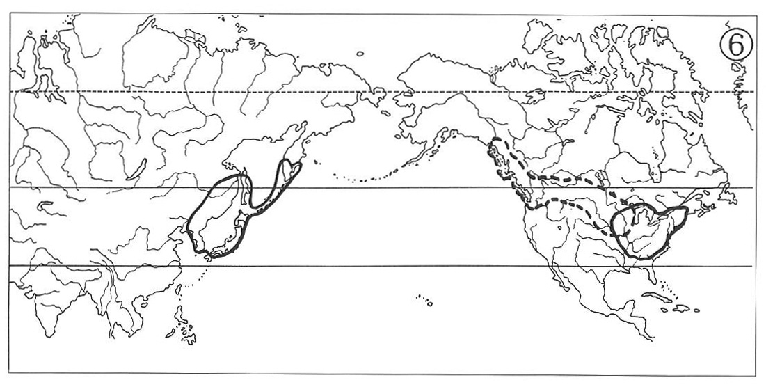 現在,東亜と北米の間の植物の隔離分布の地理的な型については,大体4つの型が認められており,それ等は,(1)東亜-北米東部型,(2)東亜-北米西部型,(3)東亜-北米東部及び西部型,(4)東亜-北米広分布型,という地理的な型に分けるのが専門家の間のコンセンサスのようである.
