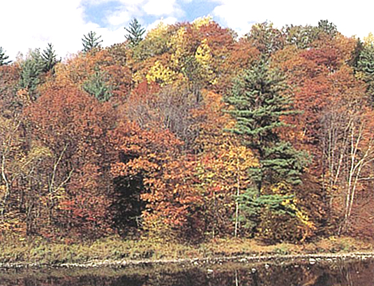 - ブナ、カエデ、ハンノキ類中心の落葉樹林の秋。多少の針葉樹も見える。ヴァーモンド州で。