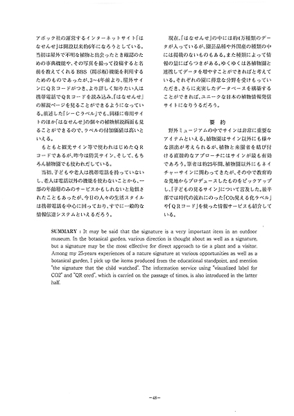 野外ミュージアムの中でサインは非常に重要なアイテムといえる。植物園はサイン以外にも様々な演出が考えられるが、植物と来園者を結び付ける直接的なアプローチにはサインが最も有効であろう。筆者は約25年間、植物園以外にもネイチャーサイン®に関わってきたが、その中で教育的な見地からプロデュースしたものをピックアップし、「子どもの見るサイン」について言及した。後半部では時代の流れにのった「CO2見える化ラベル」や「QRコード」を使った情報サービスも紹介している。