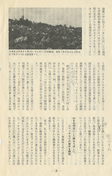 しかし、いかに役所の仕事とはいえ、私は数千万株の樹木をブッタ切り、また、その何十倍かの草類の根絶やしにしました。その埋め合せをしなければという潜在的な償いの心が、このような道を選ばせたのかも知りません。