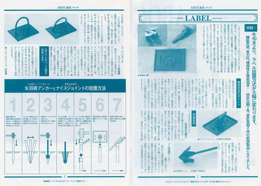 アボックラベルがイメージチェンジいたします。当社では、社業20年を契機として、将来技術の見直しの中で、長年の懸案であったラベル設置部の改良開発をすすめてきましたが、このほど3つの新部品の開発にこぎつけ、今10月より実施することになりました。いずれも特許2件を出願する新規な考案です。また、従来の部品がそのまま使えますし、価格も変わりませんので、皆さまのご認可をいただきながら、すみやかに移行していきたいと存じます。
