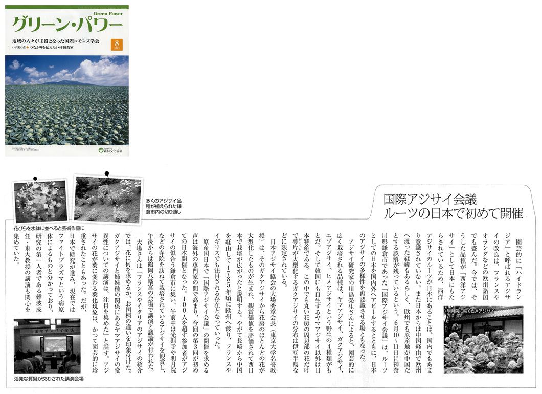 国際アジサイ会議 ルーツの日本で初めて開催―2013年8月1日発行のグリーン・パワーに、アボック社協賛の国際アジサイ会議が紹介されました。